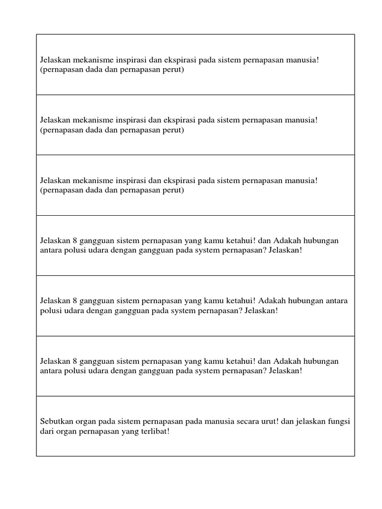 Untuk lebih jelasnya, proses bernapas diawali dengan oksigen yang dibawa ke tubuh melalui udara yang dihirup ke dalam dan diangkut ke seluruh mekanisme pernapasan pada manusia ada 2 yaitu pernafasan dada dan pernafasan perut namun di artikel ini kami lebih menjelaskan pada organ. Jelaskan proses pernafasan perut : Layaknya sistem pernapasan dada, pernapasan perut juga terdiri dari proses inspirasi dan ekspirasi dimana terdapat prinsip tekanan zat gas. Jelaskan perbedaan mekanisme inspirasi dan ekspirasi pada pernapasan dada dan pernapasan perut mas dayat : Jelaskan proses terjadinya pernapasan perut. Melalui pernafasan, maka penyaluran oksigen dari luar tubuh ke seluruh tubuh akan berjalan dengan baik. Diafragma sendiri adalah otot rangka berbentuk diafragma memegang peranan penting dalam proses pernapasan. Diafragma digunakan terutama dalam pernafasan perut. Jelaskan proses pernafasan perut : Ketika otot diafragma mengangkat pangkal tulang rusuk dan tulang dada, serta memperluas tulang rusuk ke depan, samping, dan belakang. Teknik pernafasan saat persalinan : Mekanisme pernafasan terbagi menjadi proses inspirasi dan ekspirasi yang dilakukan dengan cara pernafasan dada dan pernafasan perut. Proses pertukaran gas terjadi dengan cara difusi.